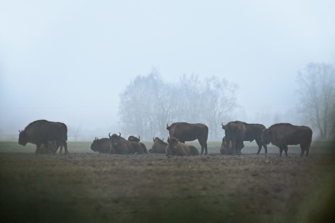 Группу зубров из Национального парка «Орловское полесье» запечатлели во время отдыха на одном из полей региона.