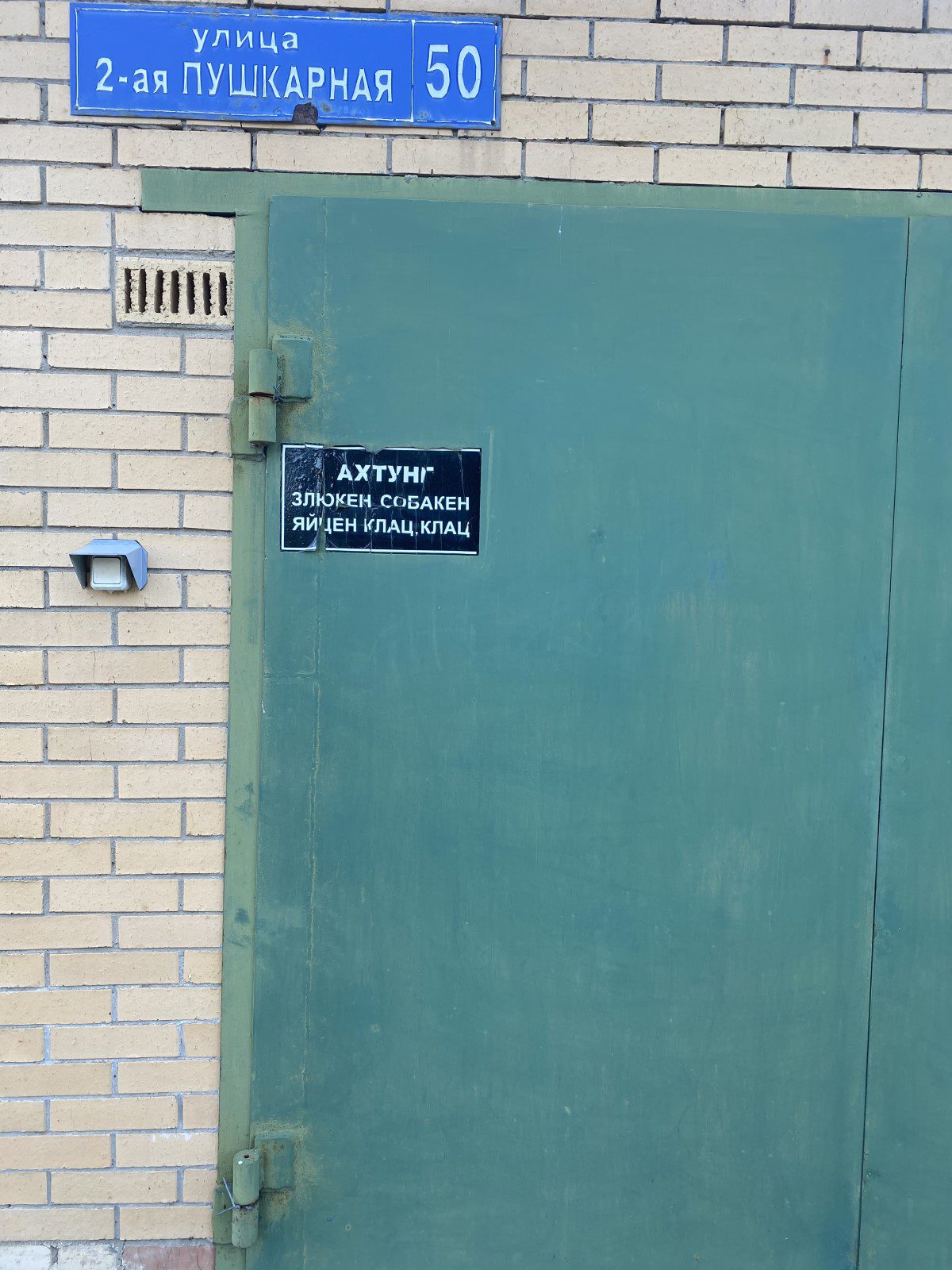 А тут ещё так случилось, что все, кто всё-таки добирается до полдома-музея, краснеет иль бледнеет – зависит от воспитания. Барышни краснеют, мужчины белеют от возмущения. Потому как есть третья беда – сосед напротив. Он вообще-то уважаемый человек и, наверное, приколист. Повесил у себя на воротах знатную табличку. Вот она, на фото.