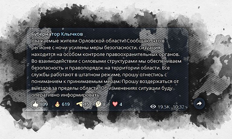 «Уважаемые жители Орловской области! Сообщаю, что в регионе с ночи усилены меры безопасности, ситуация находится на особом контроле правоохранительных органов. Во взаимодействии с силовыми структурами мы обеспечиваем безопасность и правопорядок на территории области. Все службы работают в штатном режиме, прошу отнестись с пониманием к принимаемым мерам. Прошу воздержаться от выездов за пределы области. Об изменениях ситуации буду оперативно информировать», – заявил Клычков.
