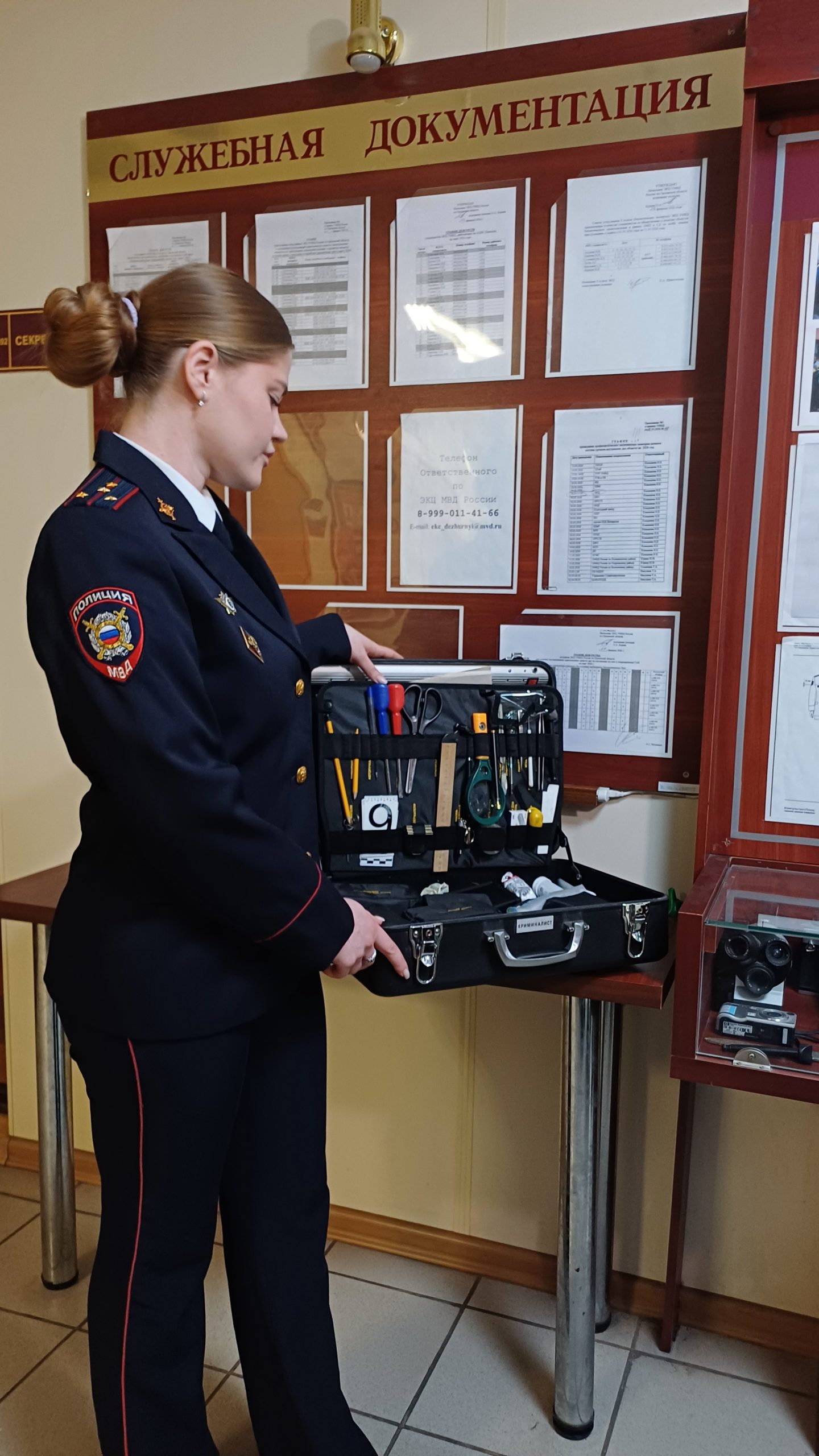 Далее в коридоре нас ждал «чудо-чемоданчик» – мобильный набор эксперта, укомплектованный до последнего винтика. Тут и дактилоскопические порошки, кисти, лупы, различные контейнеры для биоматериалов, осветители и источники ультрафиолета. Обилие инструментов создавало впечатление, что с таким арсеналом можно найти улику даже там, где ничего нет.
