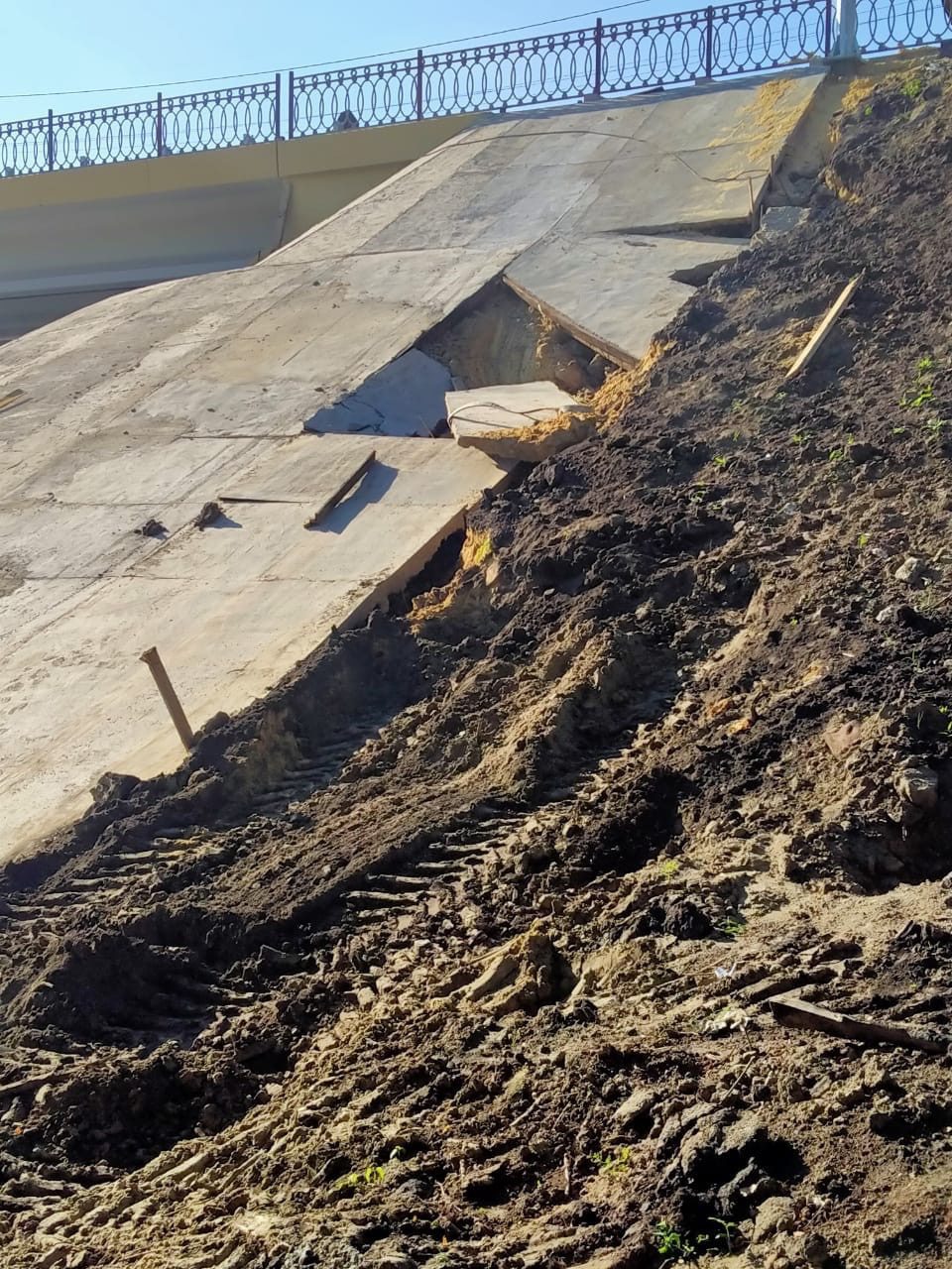 В соцсетях появились фотографии разрушений на мосту Дружбы в Орле. На кадрах видно, что пострадали укрепления земляных откосов. Одна из плит сломалась.