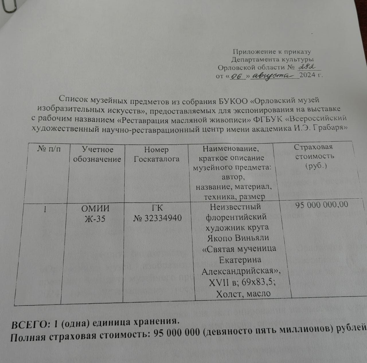 В 2024 году в другие регионы отправилось лишь несколько картин (не 500 и не 600, как предполагал Верижников). Так, к примеру, Всероссийский художественный научно-реставрационный центр имени И.Э. Грабаря на время забрал картину «Святая Екатерина Александрийская» неизвестного флорентийского художника круга живописца Якопо Виньяли. Третьяковская галерея заинтересовалась работой П.П. Осовского «Велосипедисты» – полотно из орловского музея украшало выставку «Век спорта. К 100-летию московского спорта». На днях музей импрессионизма забрал «Портрет Петра Мака» автора Натальи Гончаровой.