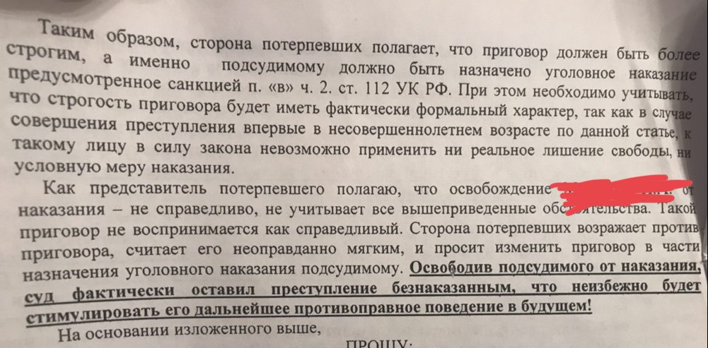 Апелляционный суд от прессы закрыли по настоянию мамы потерпевшего. Государственный обвинитель, по словам Татьяны, просил судью оставить приговор первой инстанции без изменений. Но мама потерпевшего продолжает настаивать на уголовном наказании для Максима.