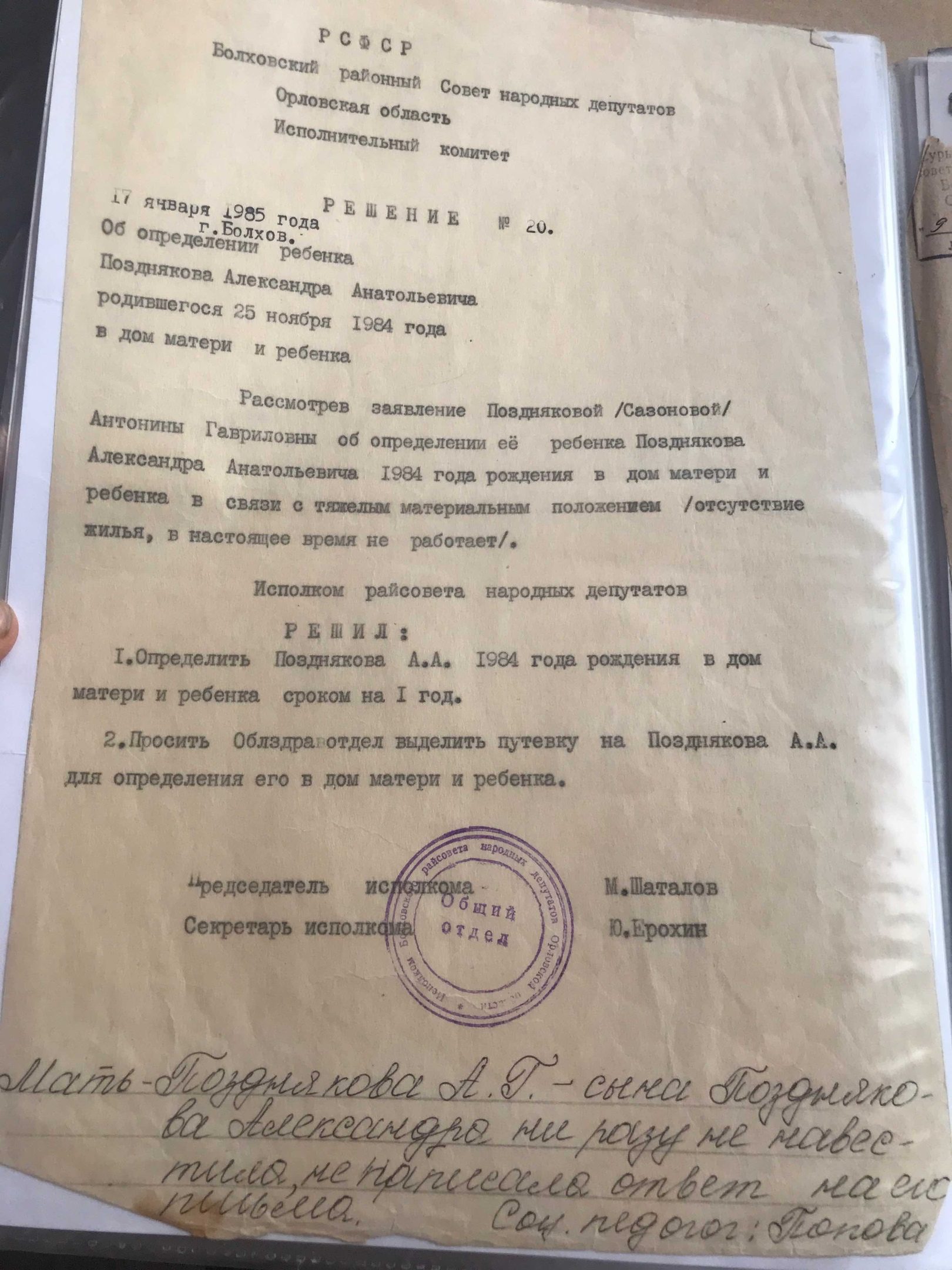 Александру Позднякову 35 лет. Он инвалид с рождения. Всё детство провёл в интернатах. Сначала учился в Детском доме №4 г. Мценска, затем в Тельческой школе-интернат, потом отправился получать профессию тракториста в Никольском училище Свердловского района. По закону, сирота должен был получить жильё от государства. За этим он обратился в администрацию Болховского района после того, как выпустился из училища. Вместо этого местные чиновники зарегистрировали инвалида в доме, который якобы принадлежал его матери. Сироту привезли в полуразваленное здание.