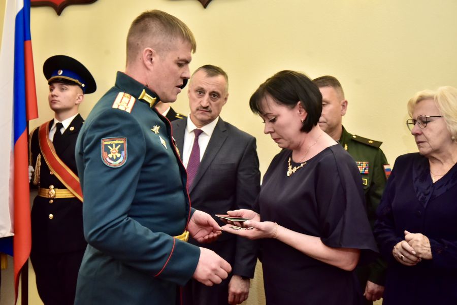 Золотую Звезду Героя и орден Мужества вдове погибшего вручил прибывший в Орёл врио заместителя командующего войсками Московского военного округа генерал-майор Олег Брагин.