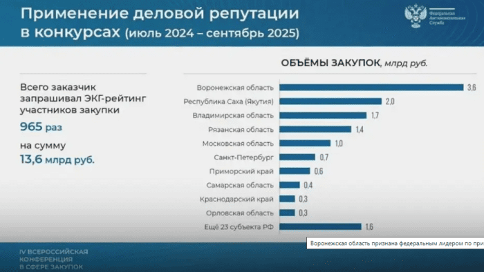 Данная информация была озвучена в Сочи на IV Всероссийской конференции в сфере закупок, организованной Федеральной антимонопольной службой России. Одним из ключевых вопросов обсуждения стало использование ЭКГ-рейтинга. Лидером по внедрению данного инструмента была названа Воронежская область: в регионе с июля 2024 по сентябрь 2025 года деловая репутация участников торгов оценивалась при проведении конкурсов на 3,6 млрд рублей.