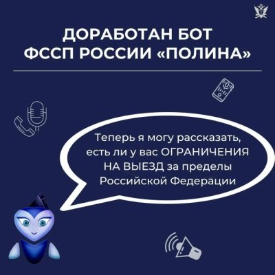 УФССП России по Орловской области сообщило о завершении процесса совершенствования бота по имени «Полина». Теперь виртуальная помощница судебных приставов умеет анализировать данные и выдавать ответы на вопросы, касаемые ограничения выезда за пределы России.