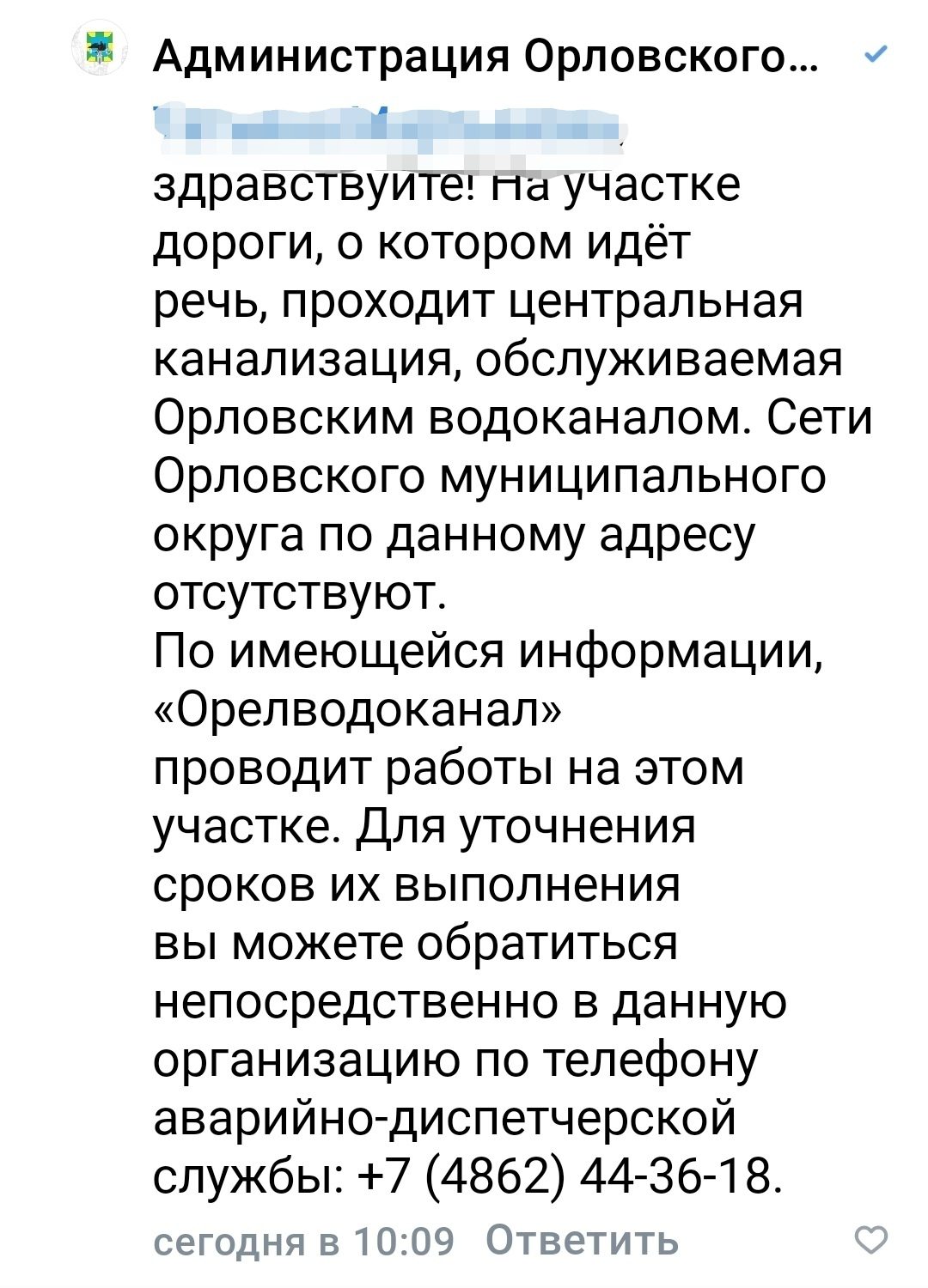 В подтверждение своих слов горожанка прислала и ответ Администрации Орловского МО. В нём указывается, что «Орёлводоканла» проводит некие работы, однако сроки завершения орловчанке рекомендовали уточнить в самой организации.