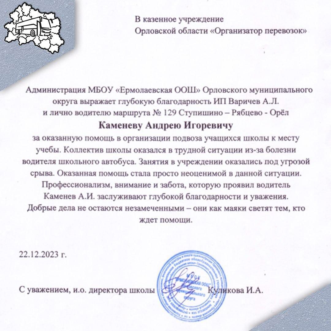 Также «Организатор перевозок» опубликовал благодарственное письмо, написанное администрацией школы, в адрес водителя и его работодателя ИП Варичева А.Л.