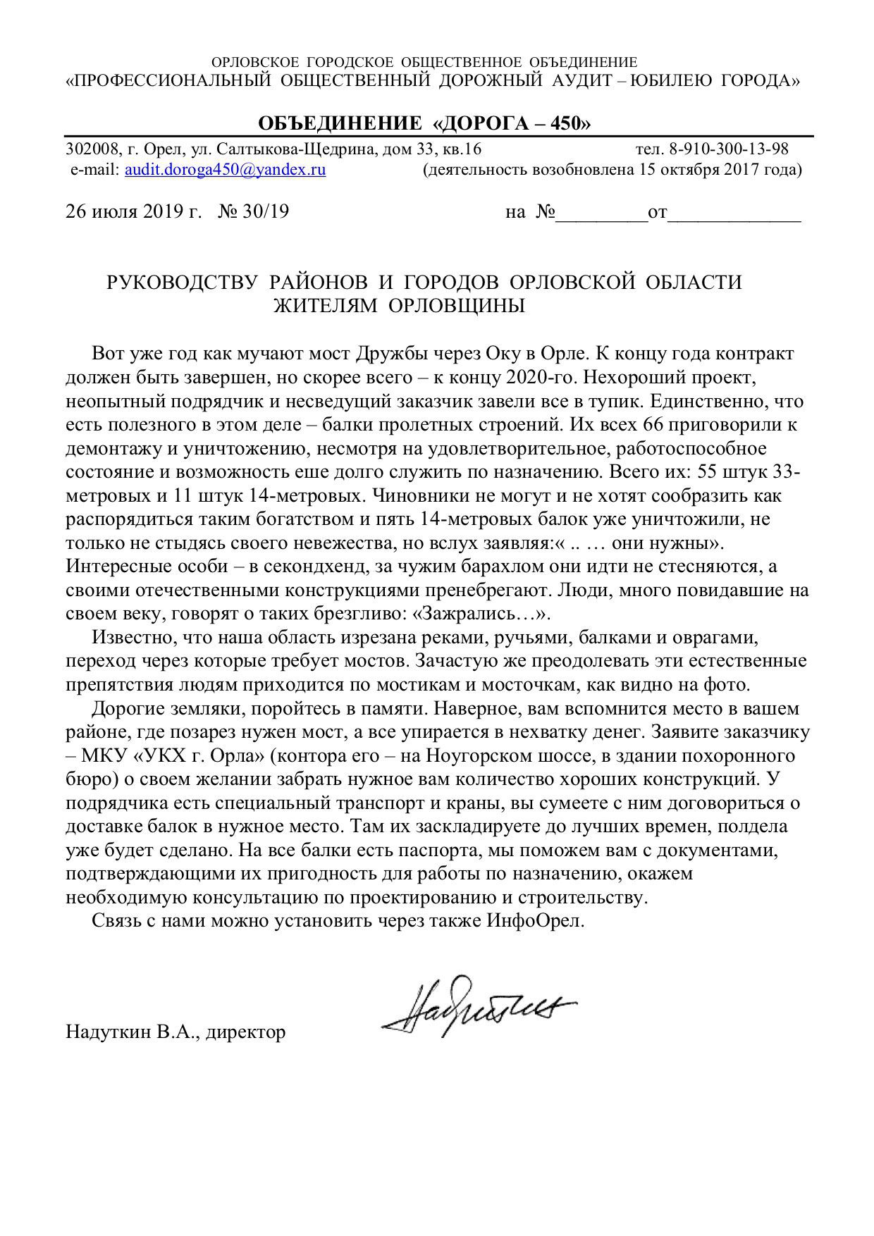 «Дорогие земляки, поройтесь в памяти. Наверное, вам вспомнится место в вашем районе, где позарез нужен мост, а все упирается в нехватку денег. Заявите заказчику – МКУ «УКХ г. Орла» (контора его – на Наугорском шоссе, в здании похоронного бюро, так совпало) о своем желании забрать нужное вам количество хороших конструкций. У подрядчика есть специальный транспорт и краны, вы сумеете с ним договориться о доставке балок в нужное место. Там их заскладируете до лучших времен, полдела уже будет сделано. На все балки есть паспорта, мы поможем вам с документами, подтверждающими их пригодность для работы по назначению, окажем необходимую консультацию по проектированию и строительству».