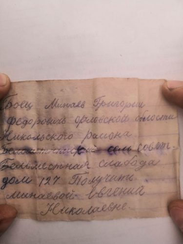 С медальоном была записка, которая хорошо сохранилась. Из неё поисковики узнали, что погибшим красноармейцем оказался Минаев Григорий Фёдорович из Орловской области, Никольского района, Беломестной слободы, дом № 127.