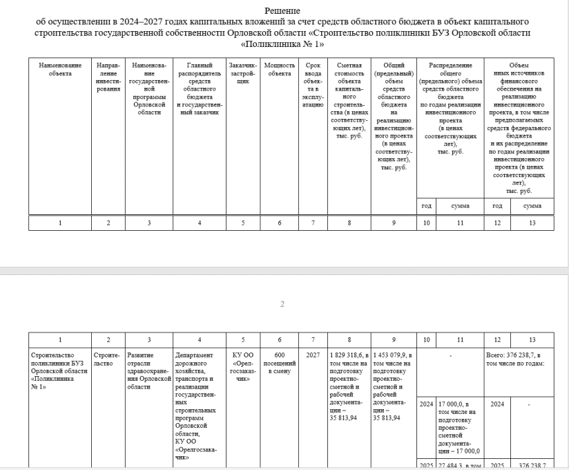 Региональное правительство внесло изменения о выделении бюджетных инвестиций в объект капитального строительства БУЗ Орловской области «Поликлиника № 1».