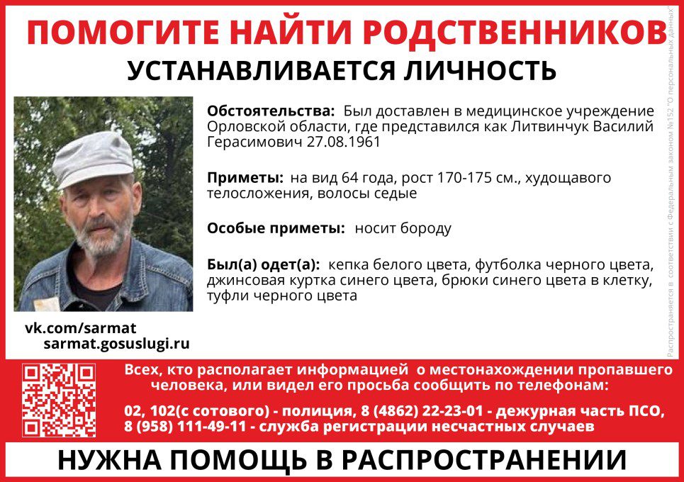 В медицинское учреждение Орловской области был доставлен дезориентированный пожилой мужчина. Он представился как Василий Герасимович Литвинчук. Также указал примерную дату рождения: 27.08.1961.