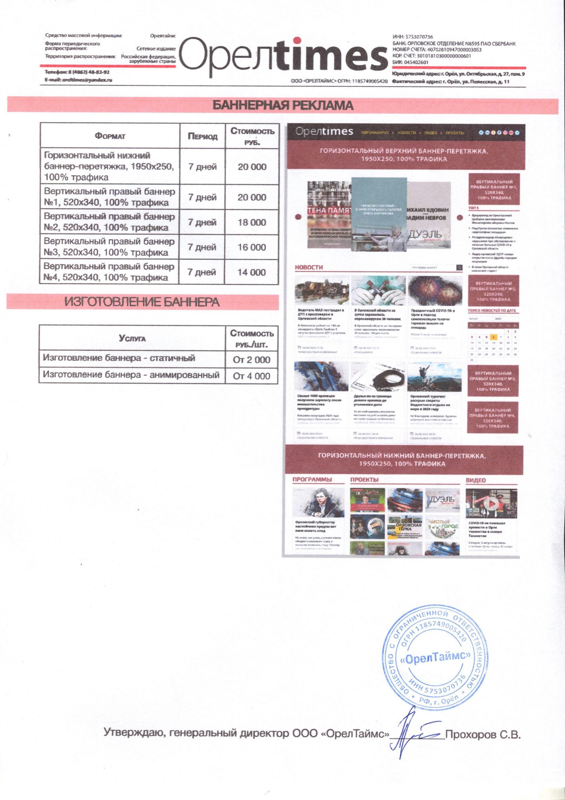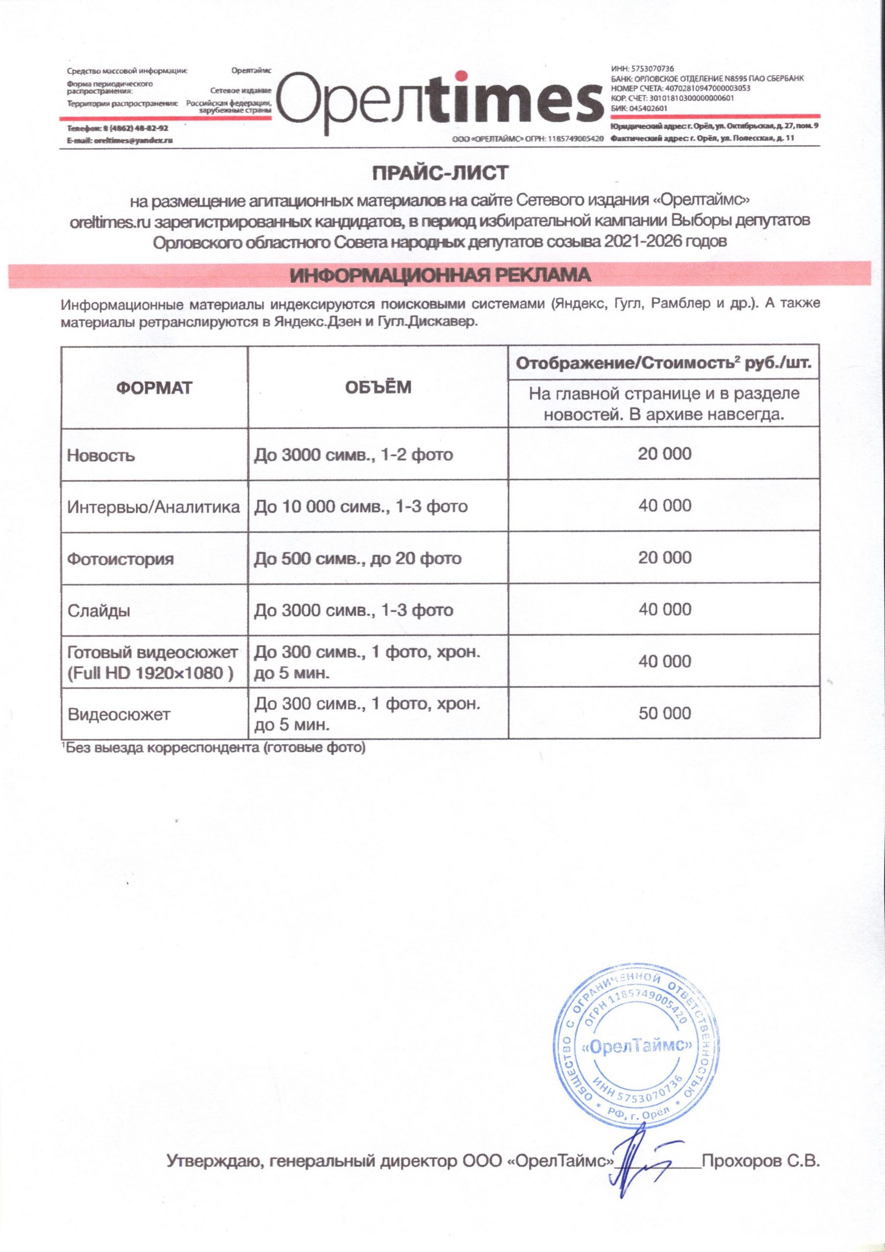 Прайс-лист на размещение агитационных материалов на сайте СИ «ОрелТаймс» в период выборов депутатов в Орловский облсовет созыва 2021-2026 гг.