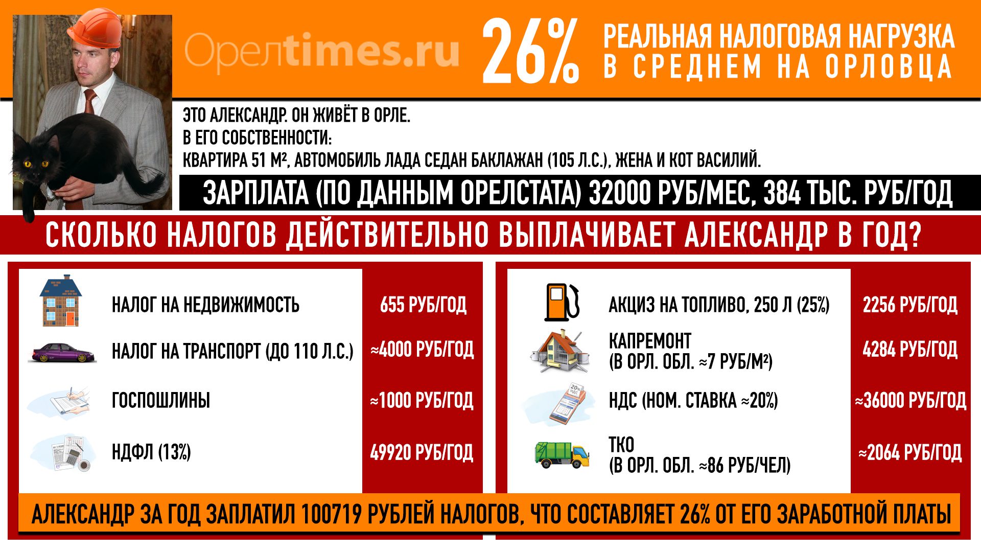Исходные данные: орловец Александр живёт в собственной квартире 51 м², имеет машину (105 л.с.), жену и кота. Заработная плата (Орёлстату мы верим, а посему возьмём величину, среднюю по области) 32 000 рублей в месяц или 384 000 рублей в год.