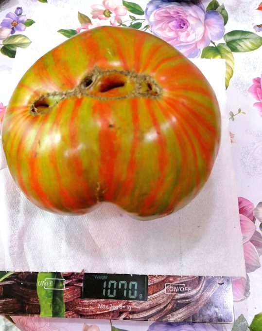 А вот Маргарита Чубарикова гордится своим помидором-гигантом. Его вес составляет 1,1 кг.