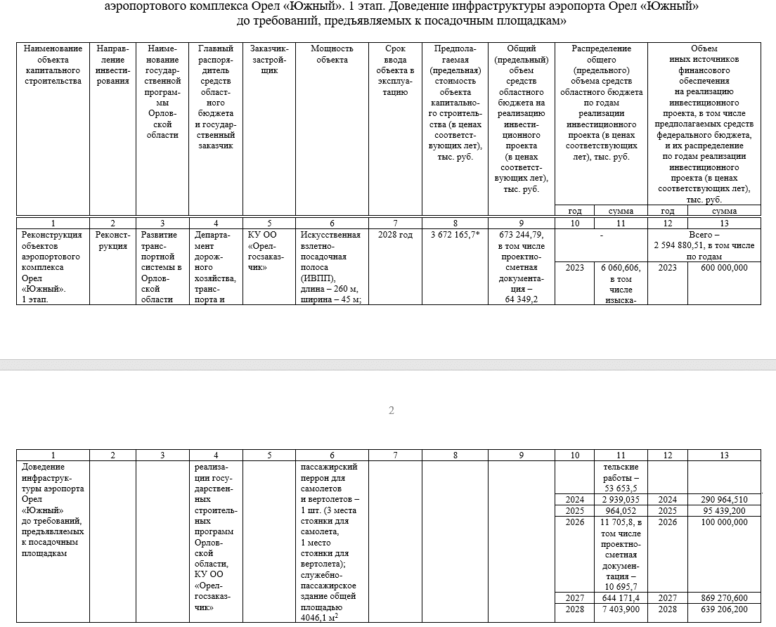 Губернатор Клычков внёс изменения в постановление «О принятии решения о подготовке и реализации бюджетных инвестиций в объект капитального строительства «Реконструкция объектов аэропортового комплекса Орёл «Южный».1 этап. Доведение инфраструктуры аэропорта Орел «Южный» до требований, предъявляемых к посадочным площадкам»».
