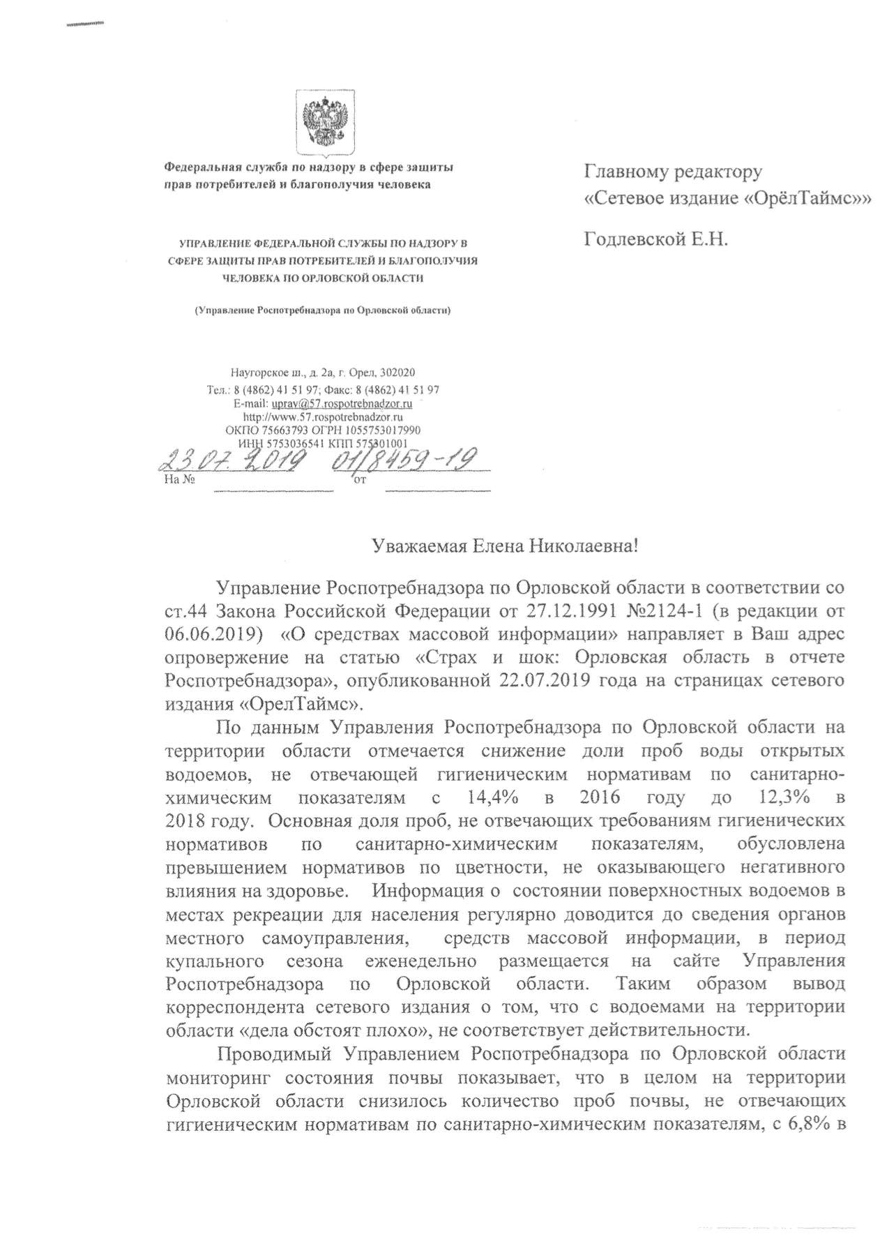 Уточнения “Роспотребнадзора” по Орловской области на публикацию “ОрёлТаймс”