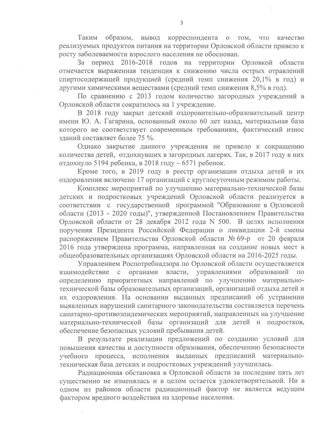 Что касается строительства и эксплуатации объектов для детей и подростков. В публикации приведены обобщающие данные по Российской Федерации, которые, действительно заставляют задуматься и даже приводят в шок: в России закрывается больше учреждений, чем их строится. За период 2013–2018 годы новых детских учреждений появилось всего 3710, а сокращение произошло на 5 тысяч. Орловщина же, согласно данным ведомства, попала в число регионов, нуждающихся в дополнительных программах по капитальному ремонту подобных учреждений. «Ропотребнадзор» по Орловской области информирует, что с 2013 года количество оздоровительных учреждений сократилось на 1 единицу (сейчас на территории Орловской области лагерей всего 17), при этом к 2018 году выросло количество детей, отдохнувших в оздоровительных лагерях.
