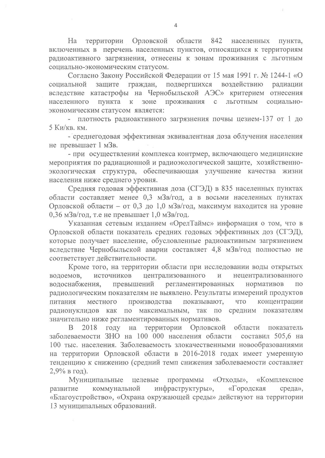 При этом, радиационная обстановка в Орловской области за последние пять лет существенно не изменилась. Ни в одном из районов области, по данным «Роспотребнадзора» по Орловской области, радиационный фактор не является ведущим фактором вредного воздействия на здоровье населения. Среднегодовая доза излучения не превышает 1,0 мЗв/год. Вместе с тем, в отчёте федерального ведомства на странице 74 указано, что в Орловской области до сих пор в отношении отдельных групп населения не полностью обеспечивается выполнение нормативных требований радиационной безопасности.