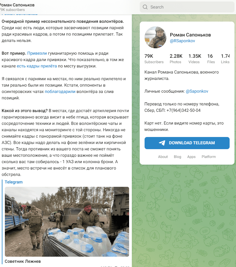 Российский военкор Роман Сапоньков указал на несознательное поведение волонтёров. Судя по размещённой информации и гиперссылкам, речь идёт о посте в telegram-канале советника орловского губернатора Сергея Лежнева. Он, по словам Сапонькова, привёз гуманитарную помощь и «ради красивого кадра дал привязки», после чего по позициям бойцов случился прилёт со стороны ВСУ.