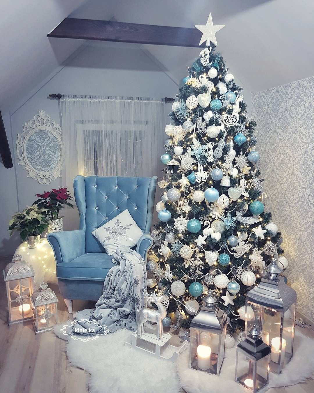 Наряжая ёлку, ограничьтесь тремя оттенками, лучше светлыми и холодными. Идеальное сочетание: белый, серебряный светло-голубой или нежно-розовый.
