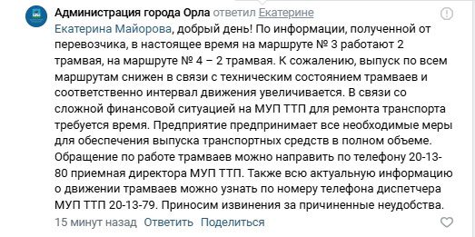 «По информации, полученной от перевозчика, в настоящее время на маршруте № 3 работают 2 трамвая, на маршруте № 4 – 2 трамвая. К сожалению, выпуск по всем маршрутам снижен в связи с техническим состоянием трамваев и соответственно интервал движения увеличивается. В связи со сложной финансовой ситуацией на МУП «ТТП» для ремонта транспорта требуется время… Маршрут № 59 обслуживает МУП «Трамвайно-троллейбусное предприятие» города Орла. На сегодняшний день по информации, полученной от перевозчика, на маршруте №59 работает 1 автобус», – пишут в администрации Орла.