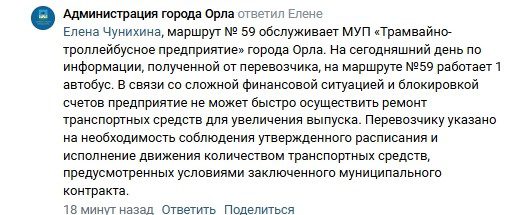 И подобных сообщений в различных группах сотни. В ответ на них поступают формальные отписки из администрации Орла, где говорят о том, что проблемы с транспортом наблюдаются во многих городах. Однако один из последних ответов мэрии заслуживает отдельного внимания.