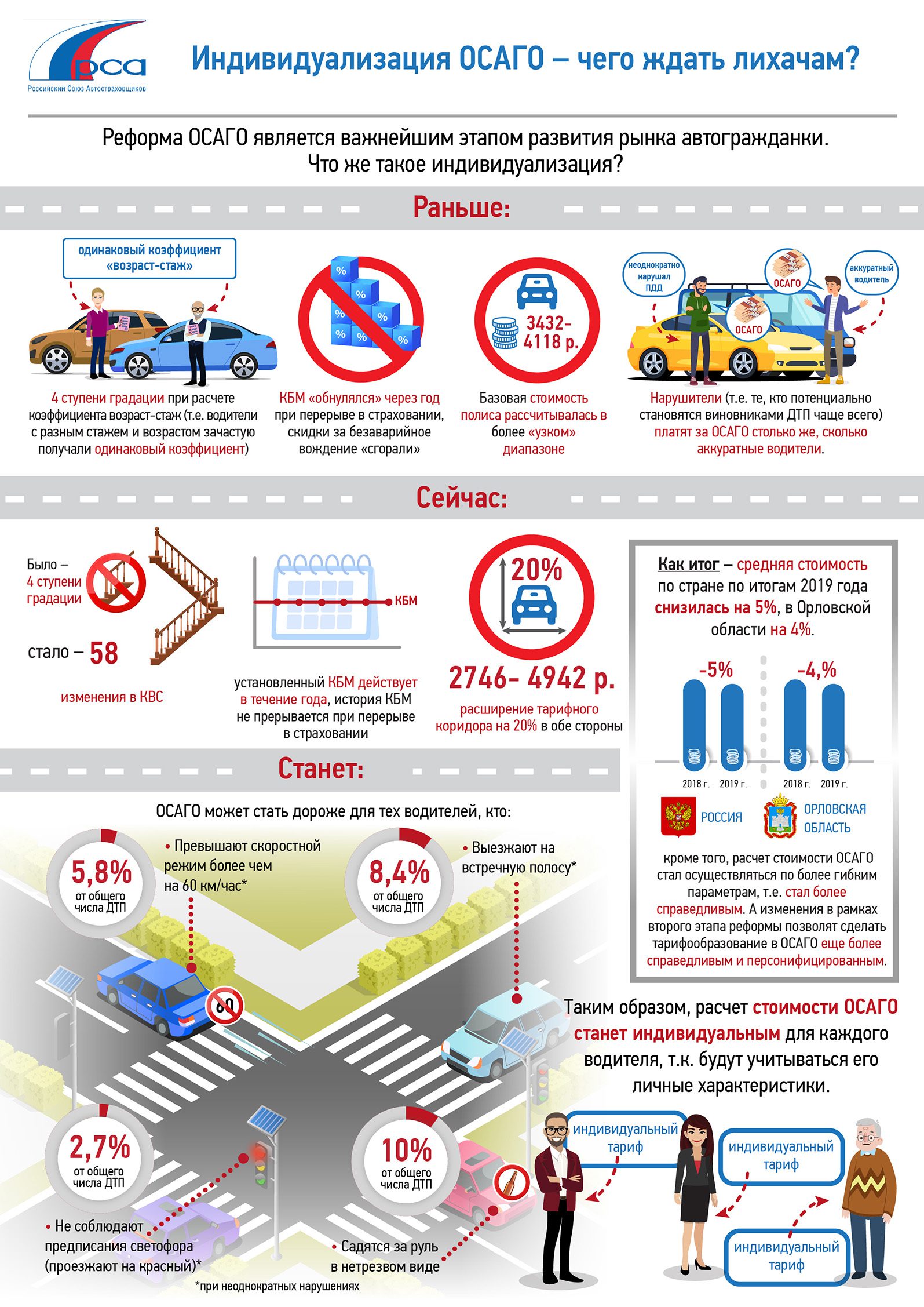Реформа поможет не только сэкономить, но и сделать рассчёт ОСАГО индивидуальным. Предусматривается введение тарифного коридора на 20% в обе стороны. В частности, полис станет дороже для нарушителей ПДД – для тех, кто привлекался к административной ответственности за проезд на красный свет, превысил скорость более чем на 60 км/ч, выезжал на встречную полосу или управлял автомобилем в состоянии опьянения.