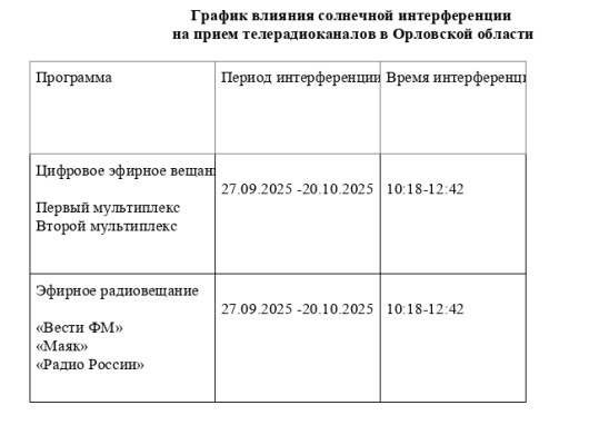 В Орловской области выход Солнца на одну ось со спутником связи возможен в период с 25 сентября по 20 ноября 2025 года с 10:18 до 12:42.
