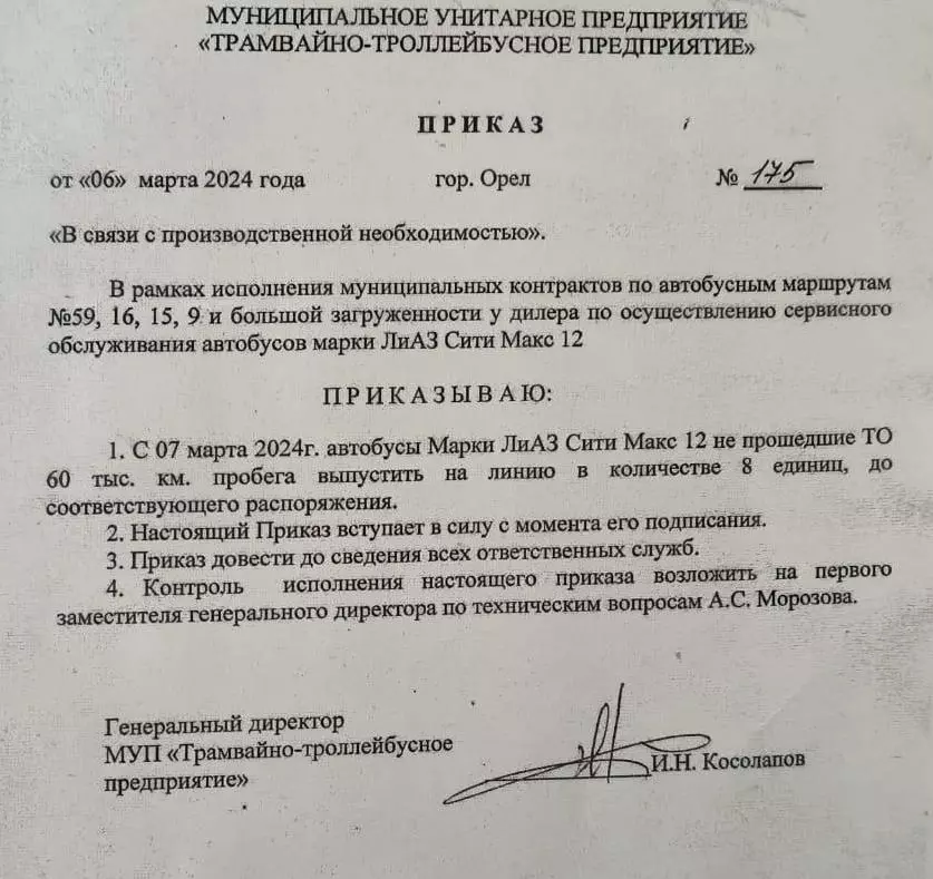 Как сообщает издание «Орловская среда-плюс», 6 марта Косолапов издал приказ о выпуске на маршруты восьми автобусов ЛиАЗ, которые не прошли техническое обслуживание на 60 тысяч километров.