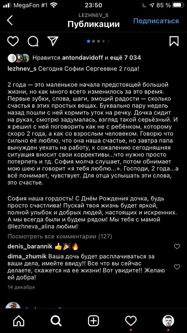 Советник губернатора Сергей Лежнев опубликовал в своём Instagram пост, посвящённый двухлетию своей дочери. Читатели поспешили искренне поздравить отца со знаменательным событием. Но не все. Один из орловцев по имени Дмитрий написал комментарий буквально следующего содержания: «Ваша дочь будет расплачиваться за ваши дела, имейте ввиду! Всё, что вы сейчас делаете, скажется на её жизни. Вот увидите. Желаю добра!».