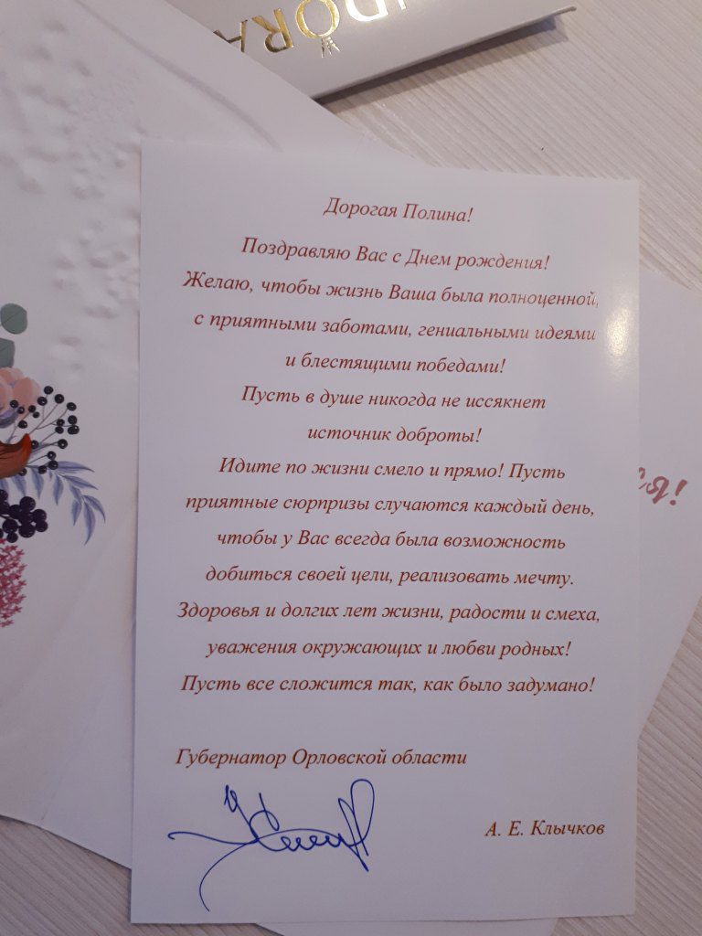 О благородном поступке своего патрона рассказал советник по СМИ Сергей Лежнев. Оказалось, что девочка давно мечтала заполучить автограф Андрея Евгеньевича, но всё никак не получалось. Мама ребёнка связалась с Сергеем Лежневым, а тот, в свою очередь, вышел на прямую с «аппаратной». И вот… в День Рождения Полины в почтовом ящике красуется письмо с поздравлениями за личной подписью губернатора.