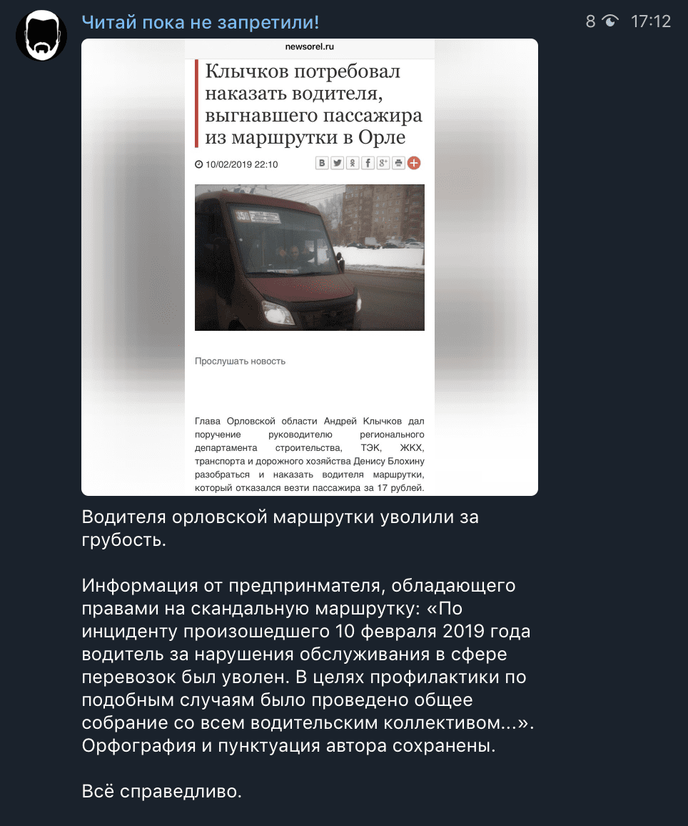 «Справедливость восторжествовала»: водителя орловской маршрутки без валидатора уволили