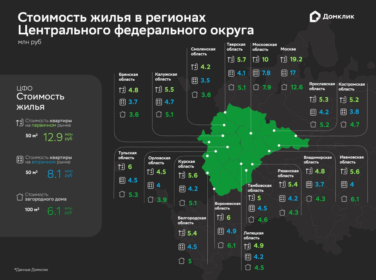 Вторичное жилье. Вторичные квартиры в нестоличных регионах ЦФО (50 кв. м.) стоят от 4 до 5 млн рублей. Самые дешёвые лоты можно найти в Смоленской (3,5 млн), Брянской и Владимирской (по 3,7 млн) областях. Самые дорогие — в Воронежской (4,9 млн), Калужской (4,7 млн), Белгородской, Тамбовской и Тульской (по 4,5 млн) областях.