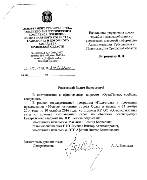 В конце мая ОрёлТаймс выпустил видеосюжет о некачественной реконструкции Центрального стадиона имени В.И. Ленина – одного из несчастных юбилейных объектов. Тогда нам удалось выяснить имена тех, кто подписал акты приёмки работ со стороны их заказчика – государственного предприятия «Орёлгосзаказчик». На днях к нам в редакцию пришёл ответ на официальный запрос в региональный департамент строительства, который раскрыл должности этих людей.