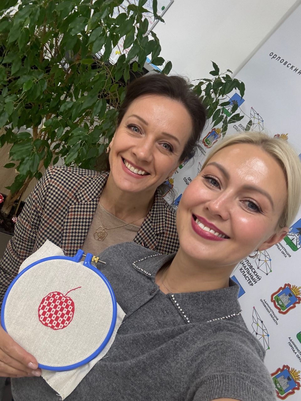 В практических занятиях принимает участие и Валерия Клычкова, которая также является многодетной мамой. Недавно она прикоснулась к Орловскому спису: «Кое-что удалось вышить», — продемонстрировала свою работу жена губернатора.