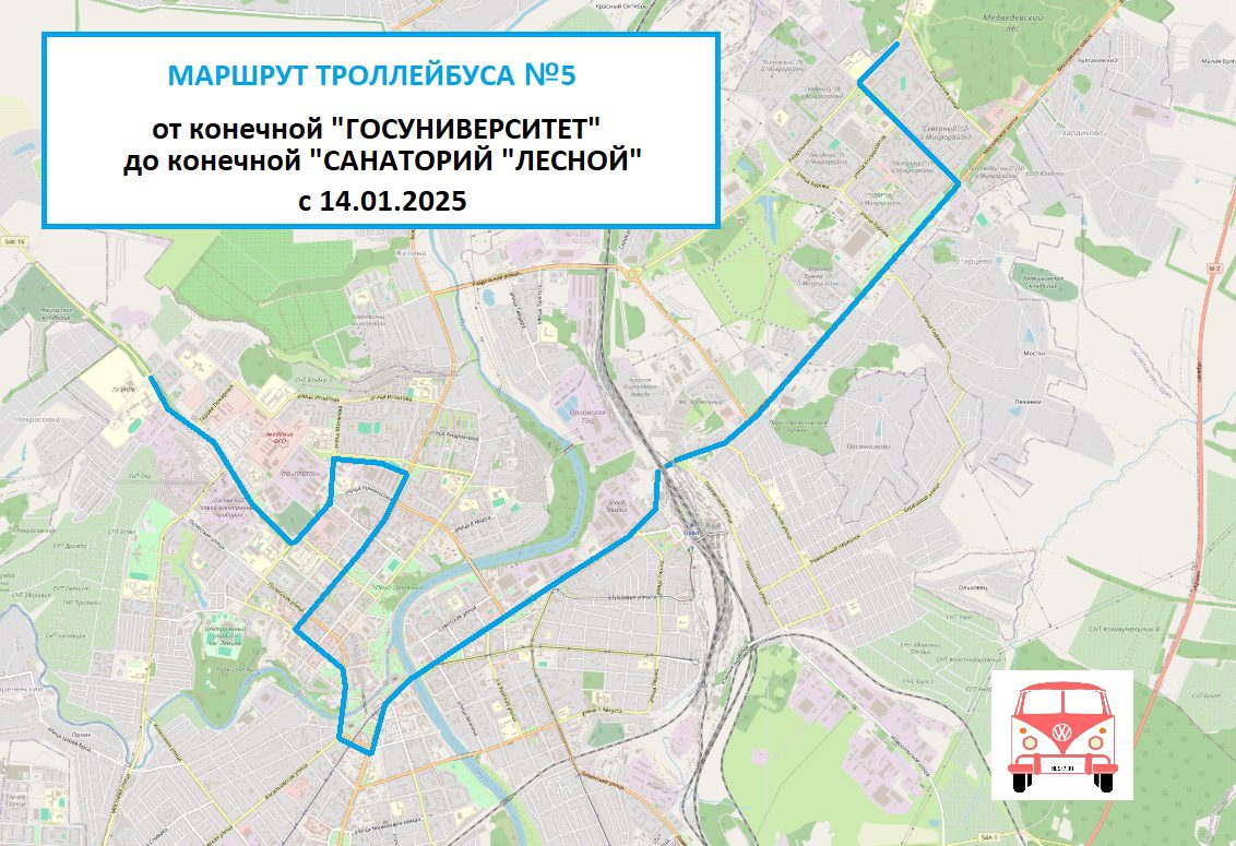 «При движении от остановки “Госуниверситет” троллейбус теперь следует через больницу им. Семашко, магазин “Орёл”, улицу Октябрьскую, а затем через “Атолл” (Дворянское гнездо), улицу Тургенева, Тургеневский мост, 1-ю Посадскую, Красный мост, гостиницу “Орел”, завод имени Медведева и далее по маршруту до конечной “Санаторий “Лесной”», – сообщает администрация канала.