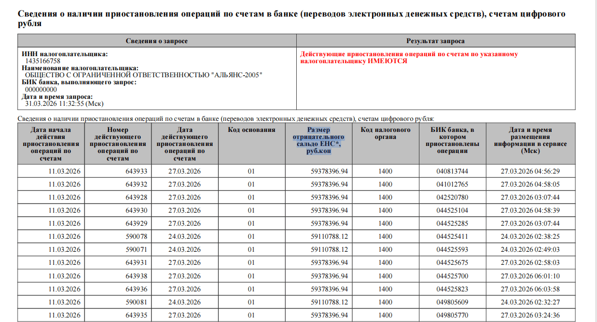 Застройщик аэропорта «Южный» в Орле якутское ООО «Альянс — 2005», по состоянию на 31 марта 2026 года, имеет решение о частичной или полной приостановке операций по счетам налоговыми органами.
