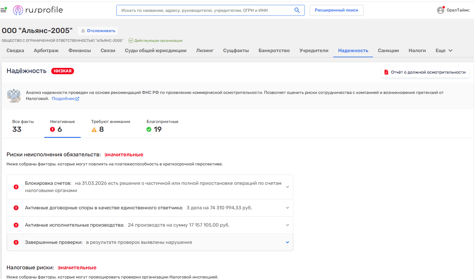 Кроме того, ООО «Альянс — 2005» выступает единственным ответчиком по активным договорным спорам на 74,3 млн рублей. Имеет 24 активных исполнительных производства на сумму в 17,1 млн рублей.