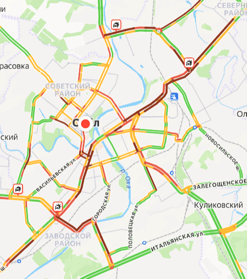 Утро понедельника в Орле началось напряжённо. Обрушившаяся на город метель парализовала движение автотранспорта. Местные жители жалуются на огромные пробки. Центральные магистрали последние два часа отмечены на картах багровым цветом. Московская, Комсомольская, Ливенская, Васильевская, а также мосты – стоит всё!