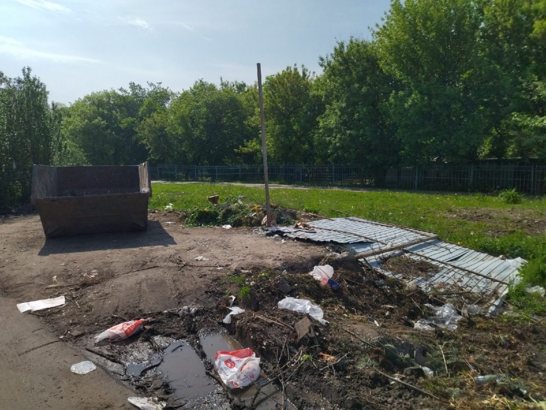 Контейнер стоит на возвышенной плите. Даже если он не заполнен полностью, мусор разлетается повсюду. В дополнение к этому мусорную свалку ежедневно посещают бродячие собаки, количество который пугает и детей, и родителей.