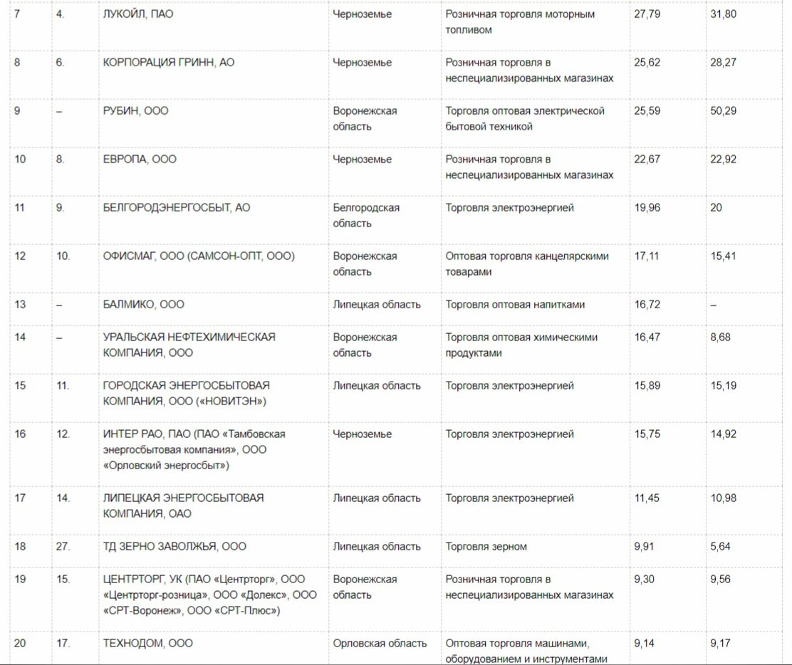 На 20 месте единственная компания–уроженка Орловской области – ООО «Технодом». Предприятие занимается оптовой торговлей машинами, оборудованием и инструментами для сельского хозяйства. Её годовой оборот в 2019 составил 9,14 млрд рублей.