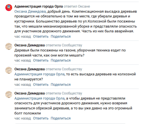 «Компенсационная высадка деревьев проводится не обязательно в том же месте, где убирали деревья и кустарники. Большинство деревьев по ул. Колхозной были посажены так, что мешали механизированной уборке и представляли опасность для участников дорожного движения», — указано в ответе с аккаунта пресс-службы мэрии.