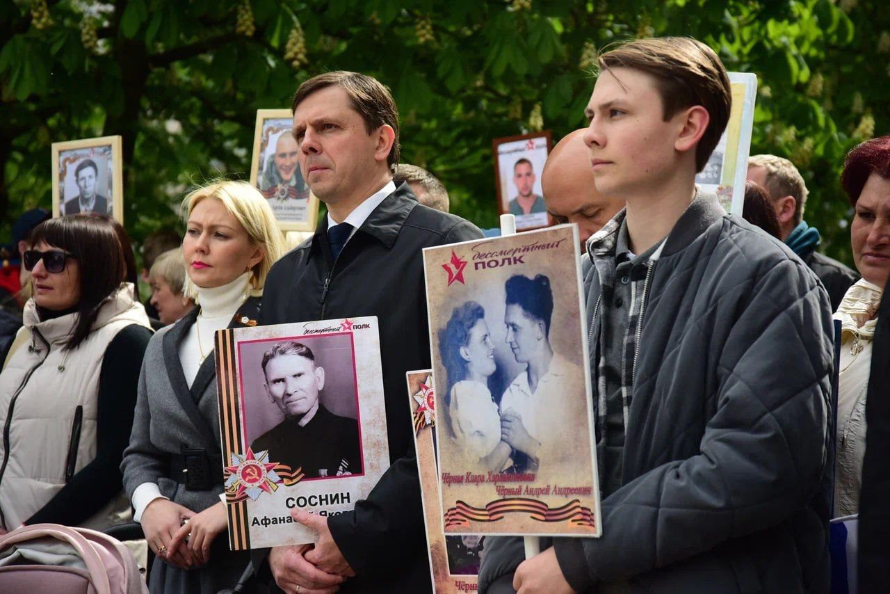 «В окнах мы видим портреты и знамёна, память – это самое главное и ценное. И мы сегодня с семьей не стали исключением, взяли портреты, с которыми мы уже выходили на «Бессмертный полк». Это наши родные – мои бабушка и дедушка и дедушка супруги. Мои бабушка и дедушка познакомились в концлагере, сбежали оттуда, дед вернулся на фронт, бабушка уехала в Крым. Дед закончил войну танкистом, нашел её в Крыму, вместе прожили всю жизнь, у них трое детей», — рассказал губернатор.