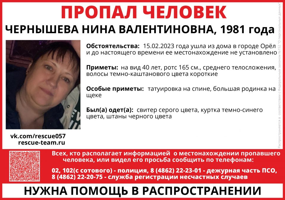 В Орле разыскивают Чернышеву Нину Валентиновну 1981 года рождения. Женщина 15 февраля ушла из дома и до настоящего времени её местонахождение не установлено. Об этом сообщается на странице официальной группы поисково-спасательного отряда «Сармат».