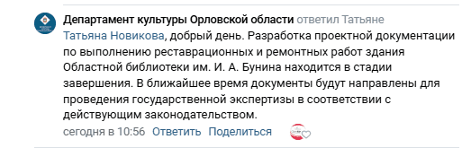 В ответ на это в региональном Департаменте культуры отметили, что разработка проектной документации по выполнению реставрационных и ремонтных работ здания библиотеки им. И. А. Бунина находится в стадии завершения.