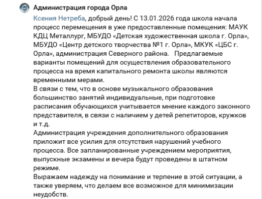 Впрочем, вопросов от этого у орловских родителей меньше не стало: «Все эти помещения находятся в разных точках Северного района. И даже их не хватает, особенно для занятий во вторую смену. Но главное: как быть детям, которые вынуждены на один урок прийти в одно помещение, предположим, на групповое занятие, а потом 20-30 минут идти до другого помещения на индивидуальный урок, а потом ещё идти и на третий?», — удивляются орловцы.