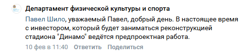 В региональном Департаменте физической культуры и спорта пояснили, что пока о какой-либо конкретике говорить рано: «В настоящее время с инвестором, который будет заниматься реконструкцией стадиона «Динамо» ведётся предпроектная работа», — указывается в ответе с аккаунта профильного департамента.
