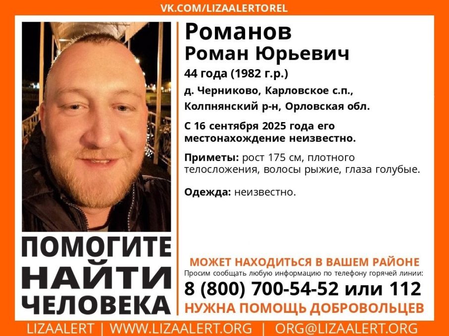 Приметы: рост 175 см, крупного телосложения, рыжие волосы, голубые глаза. Во что был одет в момент исчезновения, близкие Романа вспомнить не смогли. Предполагается, что мужчина может быть в Орле.